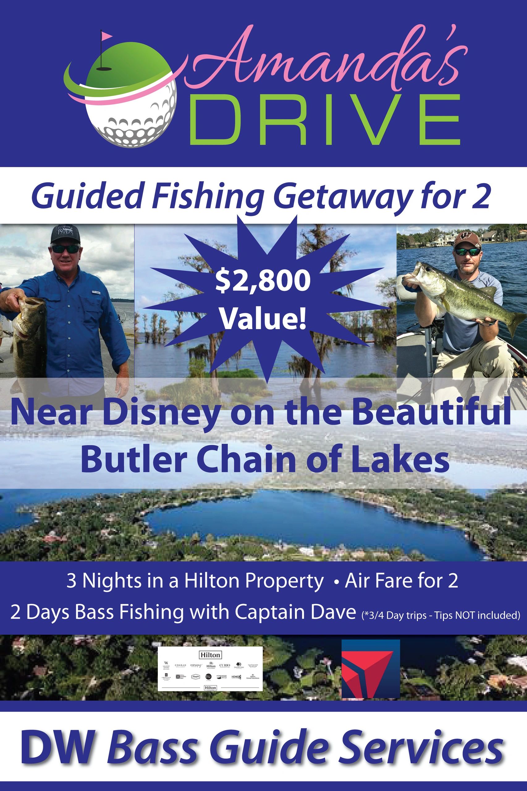 Airfare for 2 to Orlando, 3 nights in a Hilton property hotel and 2 days of Large Mouth Bass Fishing with Captain Dave on the Butler Chain of Lakes!